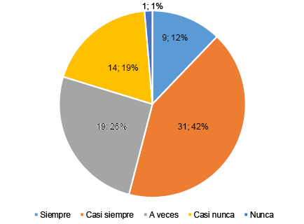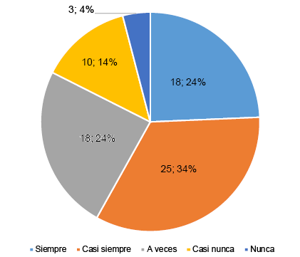 Para las restantes preguntas se toma el nivel “Siempre” y “Casi siempre” como positivos; así el 55% de los encuestados manifestó que las actividades planificadas pudieron cumplirse realizando teletrabajo, y que estas actividades fueron organizadas por la empresa en un 78%. El 55% indica que el teletrabajo les permitió cumplir con todas sus actividades laborales (Gráfico 4).