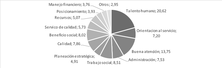Respecto a los factores de éxito que mayor relevancia tienen del emprendimiento social son el talento humano (20,62 %), buena atención (13.75 %), trabajo social (8,51 %), beneficio social (8,02), calidad (7,86 %), administración (7,53 %), y orientación al servicio (7,20 %), también es importante tener en cuenta los recursos, planeación estratégica, el servicio, y el manejo financiero entre otros.
