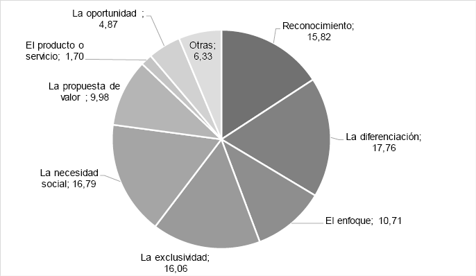 Los encuestados indicaron en el gráfico 2 que las siguientes ventajas competitivas de la empresa son: la diferenciación (16,76 %), exclusividad (16.06 %), la necesidad social que satisfacen (16,79 %), reconocimiento (15,82 %), enfoque (10.71 %) y la propuesta de valor (9,98 %), entre otros.
