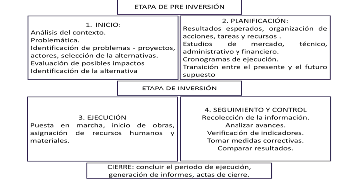 Cada una de las cuales son muy importantes si mantienen coherencia y buena lógica; se considera que la etapa de identificación determina el fracaso o el éxito del proyecto, dado que en esta se define claramente cuál es el verdadero problema que se debe resolver, y de ahí se formulan el objetivo que se pretende alcanzar, las posibles alternativas que se deben analizar y el detalle de las actividades que conlleva para su desarrollo, lo más importante se refiere a los costos en que se incurre para así evaluar su viabilidad en el diagrama 1 se esquematiza en forma completa cada una de las etapas.