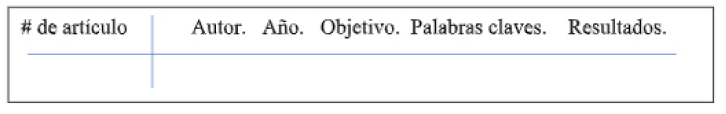 Se emplearon palabras clave, como: universidad, cultura de paz y educación para la paz, así como también se utilizó el operador booleano AND o +. Posteriormente se sistematizó la información de autores, año, objetivo del estudio, palabras claves y resultados, con ayuda de una matriz bibliográfica, como se muestra en la ilustración 2.