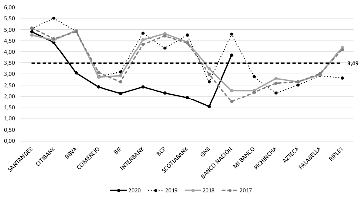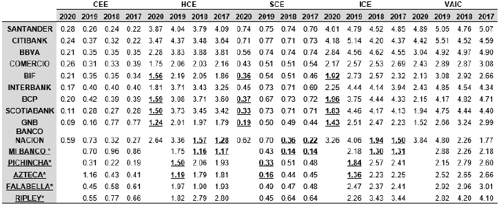 El presente estudio evalúa el VAIC de los bancos del sistema bancario peruano, así como sus indicadores asociados: la eficiencia del capital humano (HCE), la eficiencia del capital estructural (SCE), la eficiencia del capital empleado (CEE) y la relación entre ellos. Por consiguiente, abarca el periodo del 2017 al 2020 y toma como fuente los datos financieros publicados por la Superintendencia del Mercado de Valores del Perú (SMV -- Superintendencia del Mercado de Valores -- Información Financiera por Período, s. f.).