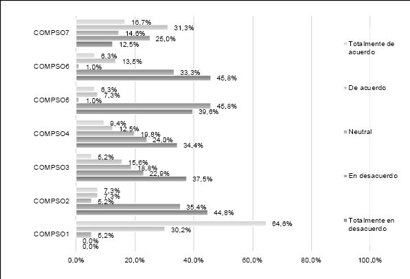 Con respecto a la variable competencia social, más del 60% de las respuestas fueron de acuerdo o totalmente de acuerdo, lo que evidencia un amplio sentido de compañerismo y empatía hacia los compañeros en las empresas de este sector (tabla 5 y gráfico 4).