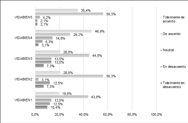 Los hallazgos muestran que en la dimensión conciencia emocional, únicamente el 4.2% de los trabajadores manifestó estar satisfecho con su manera de vivir, mientras que el 21.9% expresó estar feliz con su situación actual (tabla 2 y el gráfico 1). Esto se asocia al hecho de que generalmente los trabajadores, laboran alejados de su lugar de origen.