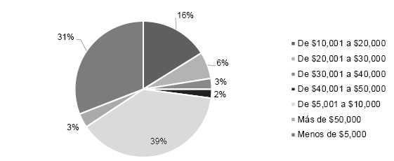 El nivel de ingresos mensual de la población se distribuye de la siguiente forma: un 31% gana menos de $5,000 pesos mexicanos (MXN); 29% de $5,000 a $10,000 MXN; 16% de $10,000-$20,000 MXN; y por último el 14% gana más de $20,000 MXN (Gráfico 2).