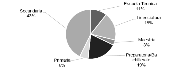 El nivel educativo más representativo de la población es secundaria, con el 43%; preparatoria/bachillerato, 19%; escuela técnica 11%; licenciatura 18% y maestría 3% (Gráfico 3).