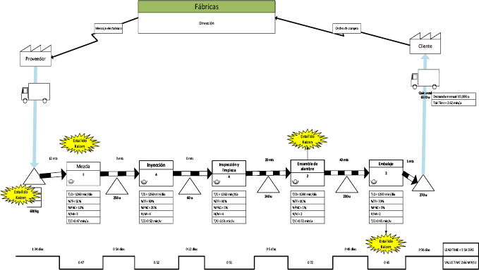 Al comparar los tiempos de ciclo (TC) de las 5 actividades de valor dentro del proceso de fabricación, se mostró que no existen actividades por sí solas mayores al Tak Time. Sin embargo, pueden surgir cambios para mejorar los tiempos de producción y no generar desgaste. Esto debido a que se recomienda que el Takt Time sea igual al tiempo de ciclo, de no ser así, significarían costos de faltante o sobreproducción; o bien que el proceso se está ejecutando más lento de lo que debería (Paredes-Rodríguez, 2017; Siregar et al, 2018). Tomando las consideraciones anteriores se logró el VSM actual del Diagrama 1.