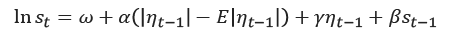 Donde st es la volatilidad del precio del petróleo, mientras que nt es una variable aleatoria generada a partir de la distribución generalizada del error de regresión. Los modelos EGARCH aseguran que la estimación de la volatilidad se encuentre en el rango de valores positivos. Esto implica que no haya que imponer restricciones en los coeficientes estimados, como usualmente se acostumbra en los modelos tradicionales GARCH.