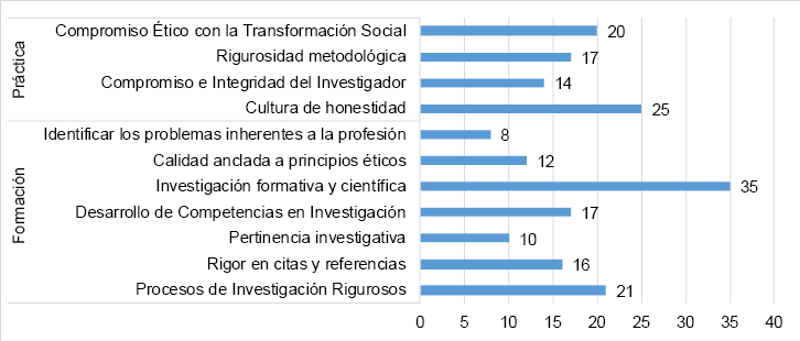Del análisis de contenido de los testimonios, se sistematiza un total de 30 indicadores, distribuidos entre las tres dimensiones, y, en cada una, se diferencian dos subdimensiones: formación y práctica. Así, en el Gráfico 1 se puede observar que la dimensión con mayor porcentaje es Docencia con 15 indicadores (50%), evidencia mayor atención en ética por el profesorado; seguida de la dimensión Investigación con 11 (37%) y de vinculación con 4 indicadores (13%).