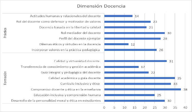 En cuanto a la dimensión, docencia, como se muestra en la tabla 1, está compuesta por los subdimensiones formación y práctica, integradas por 15 indicadores en total.