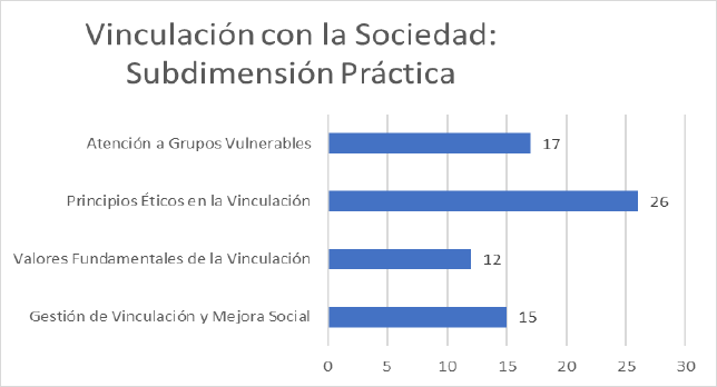 En la subdimensión Práctica se muestran 4 indicadores, el de mayor interés es la cultura de honestidad elegida por 25 docentes, seguido de 20 docentes que eligen el indicador compromiso ético de la transformación; 17 eligen rigurosidad metodológica y 14 compromisos e integridad del investigador. En la dimensión Vinculación se identifican una subdimensión y cuatro indicadores (Tabla 2):
