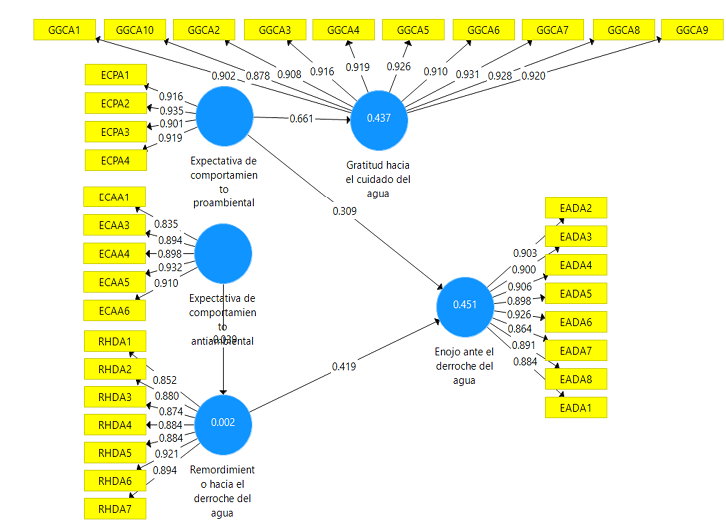 En el contexto de estudio, el enojo ante el derroche del agua se despliega en mayor grado cuando el ciudadano se enfurece al saber que a algunas personas les importe poco que el agua se acabe (carga de 0.906) y cuando se siente indignado cuando la gente desperdicia agua en su casa (carga de 0.926). Los resultados no confirman que la expectativa de comportamiento antiambiental influya positiva y significativamente sobre el remordimiento ante el derroche del agua.