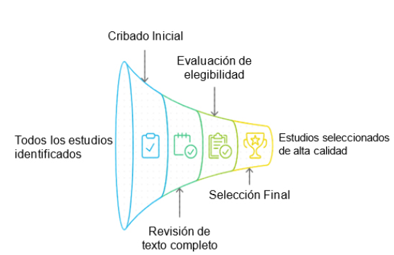 El proceso de selección de estudios siguió las fases descritas en el diagrama de flujo PRISMA, que incluyó cuatro etapas: identificación, cribado, elegibilidad y selección final. En la fase de identificación, se recolectaron todos los estudios que cumplían con los términos de búsqueda en las bases de datos. Posteriormente, se llevó a cabo un cribado inicial basado en los títulos y resúmenes para descartar los que no cumplían con los criterios de inclusión. En la etapa de elegibilidad, los estudios seleccionados fueron revisados en texto completo, y se evaluaron aquellos que cumplían con todos los requisitos. Finalmente, se seleccionaron los estudios más relevantes y de mayor calidad para su análisis detallado en el diagrama 1.