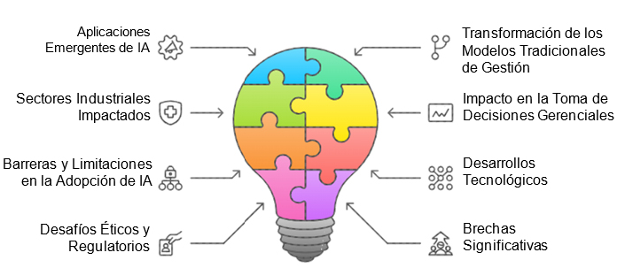 En resumen, aunque la IA está transformando rápidamente la toma de decisiones gerenciales y los modelos de gestión, la investigación también revela áreas importantes que necesitan mayor atención, como la superación de barreras tecnológicas, la creación de marcos regulatorios sólidos y la necesidad de continuar innovando en las capacidades de la IA para garantizar su implementación.