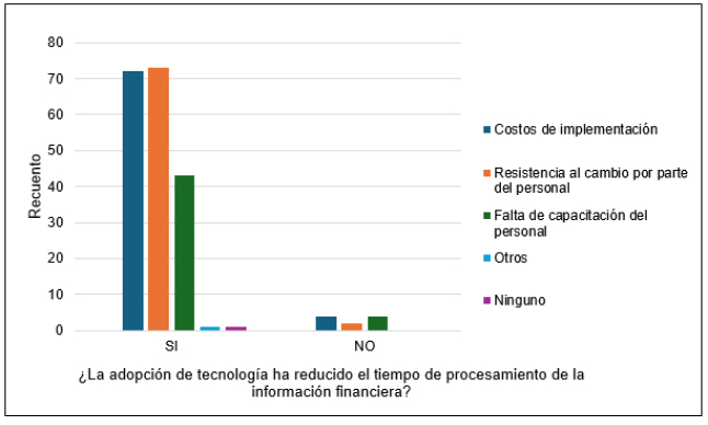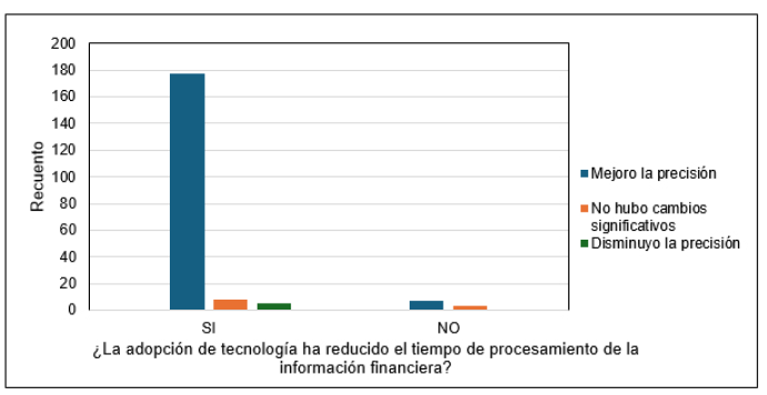 Esto sugiere que, si bien las empresas experimentan mejoras en la eficiencia y precisión, estas mejoras no necesariamente están directamente relacionadas con la reducción del tiempo de procesamiento de la información financiera, estableciendo que deben existir otros factores que han dado lugar a la reducción del tiempo, como la preparación por parte de los profesionales que laboran en el área contable de las empresas, la simplificación de procesos, etc.