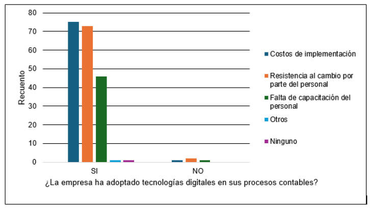A pesar de que se identificaron desafíos importantes (gráfico 4) como los costos de implementación, la resistencia al cambio y la falta de capacitación del personal, estos desafíos no parecen estar directamente relacionados con la decisión de adoptar tecnologías digitales en los procesos contables de las empresas analizadas.