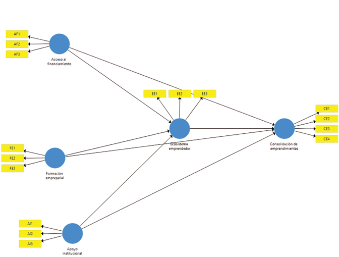 Los datos recopilados fueron analizados con SmartPLS, permitiendo realizar el Modelado de Ecuaciones Estructurales (PLS-SEM) y evaluar las relaciones entre las variables del ecosistema emprendedor (Hair & Alamer, 2022). El coeficiente de determinación (R²) mostró que el modelo explica una parte considerable de la varianza en la consolidación de emprendimientos, demostrando la relevancia de las relaciones significativas entre las variables.
