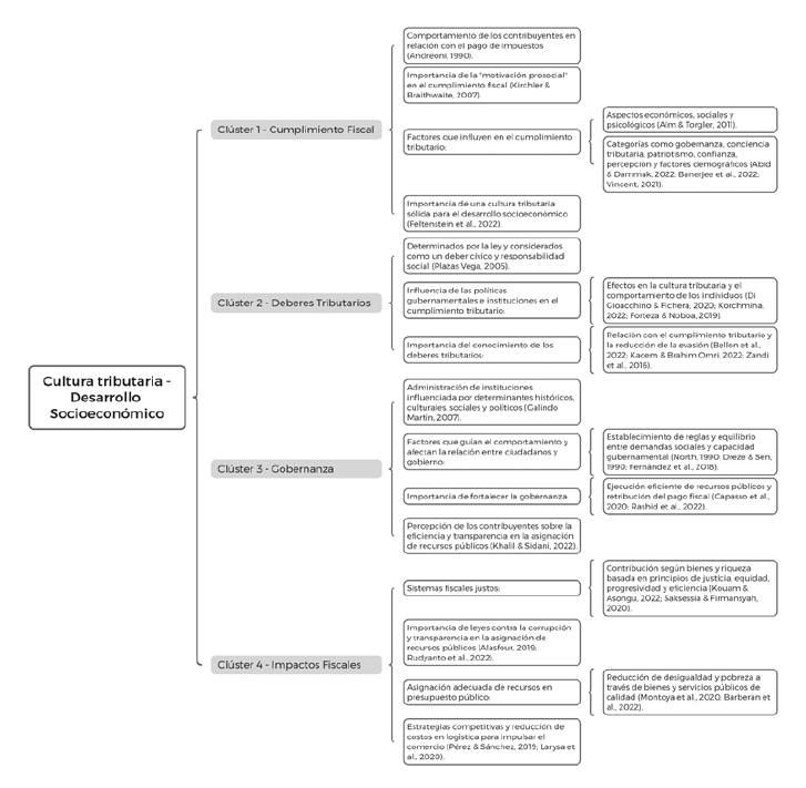 En este sentido, considerando la evolución de la investigación sobre cultura tributaria y desarrollo socioeconómico, se abre un amplio campo para explorar más a fondo la cultura tributaria de los contribuyentes. Para avanzar en este sentido, se recomienda realizar futuras investigaciones aplicadas en contextos específicos. Estas investigaciones deberían centrarse en la elaboración de políticas fiscales que apunten a mejorar la conciencia social en materia tributaria. Es esencial que estas políticas abarquen los cuatro clústeres identificados en el análisis de la bibliografía, a saber: el cumplimiento fiscal, los deberes tributarios, la gobernanza y los impactos fiscales. Al enfocarse en estos aspectos clave, las futuras investigaciones podrán proporcionar una comprensión más profunda y completa de la cultura tributaria, así como también ofrecer recomendaciones prácticas para mejorarla en diferentes contextos socioeconómicos.