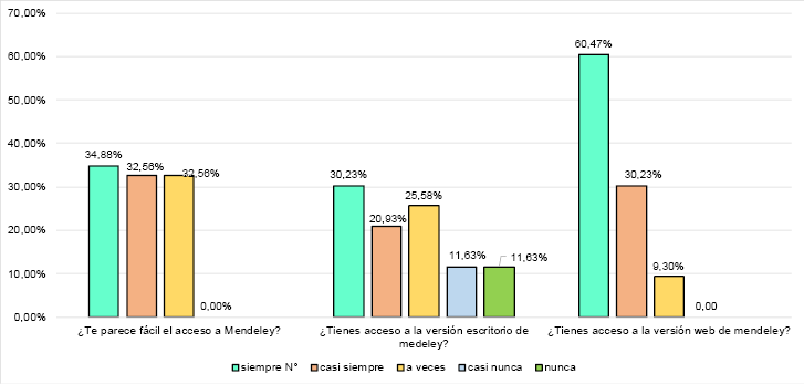 Sobre el tema objeto de estudio, el 100% de estudiantes lo empezó a utilizar a través de la asignatura de Tesis, señalando un 34,88% que siempre le parece fácil el acceso; sobre las versiones que instalo, un 60.47% manifiesta preferir la versión web y un 30.23% señala que la versión escritorio, un 25.58% señala tenerlas sincronizadas ambas opciones.