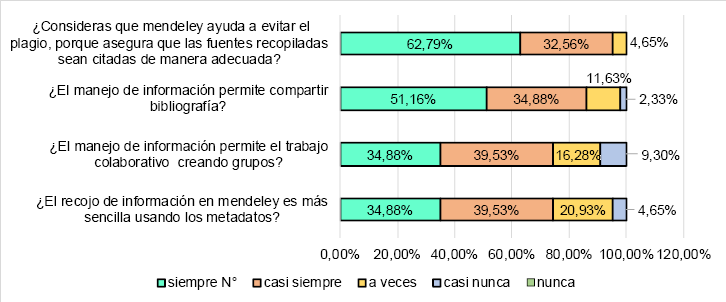 Al respecto, Laiton (2021) señaló que la información que se busca en Mendeley se puede organizar en carpetas, como formando un catálogo de investigaciones y revistas. Sobre si el manejo de información permite el trabajo colaborativo creando grupos, Menazzi (2019) señala que el trabajo de investigación que se quiere lograr demanda toma de decisiones y el poder crear una red de apoyo entre varios investigadores; es así que el mayor número, representado por un 39.53%, señala que casi siempre. Sobre si el manejo de información permite compartir bibliografía, un 51.16% señala que siempre, y si es que consideras que Mendeley ayuda a evitar el plagio, un 62.79% señala que siempre.