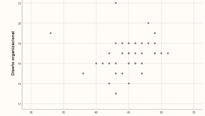 El análisis estadístico evidenció una correlación positiva débil entre el diseño organizacional y el desarrollo turístico (ρ = 0.348; sig. = 0.019), siendo este resultado estadísticamente significativo al nivel del 5% (Tabla 4). Aunque la fuerza de la relación no es elevada, sí sugiere que una estructura organizacional más sólida puede favorecer ciertos aspectos del crecimiento turístico. La nube de puntos refleja una tendencia ascendente moderada, sin una alineación perfecta, lo cual indica que la influencia del diseño organizacional sobre el turismo no es lineal ni determinante por sí sola.
