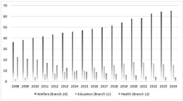 Overall, the expenditure pattern reveals a growing concentration of resources in a small number of programs, mainly within Branch 20 (Welfare), which will be analyzed in the following section. This raises important questions about the actual alignment of public spending with the principles of substantive gender equality.