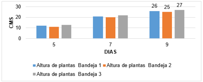 Altura de las plantas de tres bandejas a los 5, 7 y 9 días