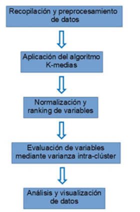 El procedimiento se compone de las siguientes fases: a) recopilación y preprocesamiento de datos: se realiza la limpieza y normalización de los datos para asegurar una correcta ejecución del algoritmo; b) aplicación del Algoritmo K-medias: se define el número de clústeres K y se ejecuta el algoritmo para agrupar los datos en subconjuntos homogéneos; c) evaluación de la importancia de las variables: se calcula la varianza intra-clúster para determinar el impacto de cada variable en la segmentación; d) normalización y ranking de variables: se invierte la relación entre la varianza y la importancia de la variable, normalizando los valores obtenidos para facilitar la interpretación de resultados; y, e) análisis y visualización de datos: se generan representaciones gráficas que destacan las variables más influyentes en la clusterización de los datos.