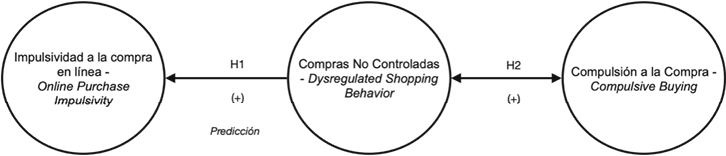 Visualmente, en el diagrama 1, el modelo puede describirse como un diagrama de flujo donde la compulsión a la compra se sitúa al inicio, conectada mediante una flecha unidireccional a las compras no controladas, las cuales, a su vez, están vinculadas con otra flecha a la impulsividad en la compra.
