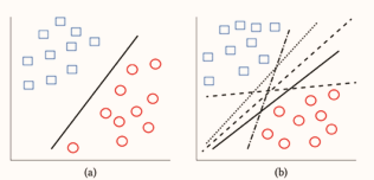 Fuente: Tutorial sobre Máquinas de Vectores Soporte, (a) ejemplo de hiperplano de separación, (b) otros ejemplos de hiperplanos de separación entre los infinitos posibles (Carmona Suárez, 2016).