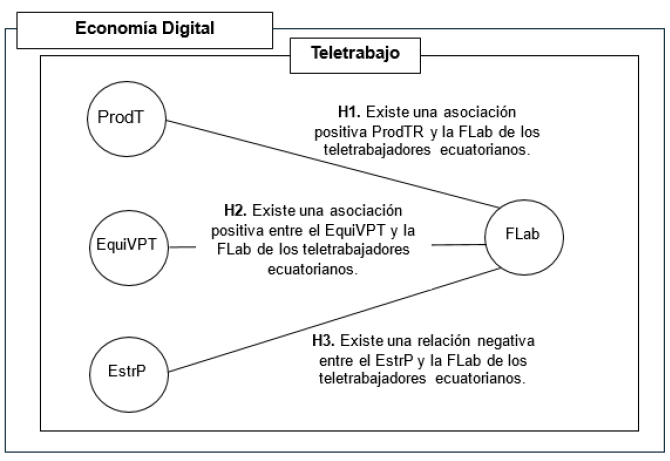 Frente a las hipótesis mostradas en el diagrama 1 y considerando la limitada producción científica sobre esta temática en Ecuador, este estudio propone evaluar la relación entre el teletrabajo, como un importante componente de la ED, y la FLab en el contexto de la economía digital ecuatoriana.