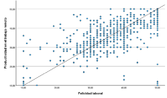 La productividad en el trabajo remoto (ProdTR) puede influir positivamente en la felicidad laboral (FLab), gracias a los beneficios que ofrece esta modalidad, como la flexibilidad, la comodidad y el acceso a tecnologías que potencian la eficiencia en el desempeño de las tareas. Estos factores permiten una mejor gestión del tiempo y una mayor adaptación a las necesidades individuales, contribuyendo al bienestar de los colaboradores (Sánchez-Toledo et al., 2021; López-Cueva et al., 2024). Lo que sugiere una relación positiva entre estas variables.