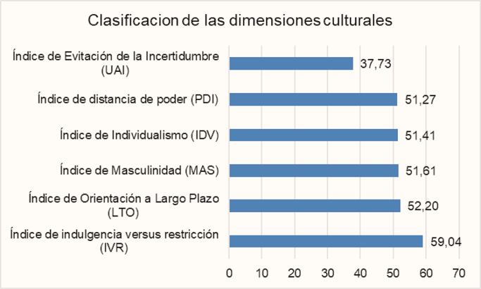 Se identificó el siguiente perfil cultural en la muestra seleccionada: se acepta en cierta medida la desigualdad de poder, tiene una leve tendencia hacia el individualismo, se inclina moderadamente hacia la masculinidad, manifiesta una necesidad equilibrada de seguridad y previsibilidad, se orienta moderadamente al largo plazo y se inclina medianamente hacia la indulgencia.