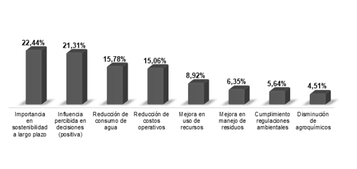 Esta limitación también se refleja en los aspectos ambientales considerados prioritarios. Destacan la eficiencia en el uso del agua (34,6%) y el efecto de agroquímicos en el suelo (28,54%), ambos directamente asociados a la rentabilidad del cultivo, pero no necesariamente a una visión holística de gestión ambiental. En cuanto a la evaluación del impacto ecológico, el 49,6% de los productores utiliza indicadores económicos como multas o costos por residuos, revelando un enfoque predominantemente reactivo.