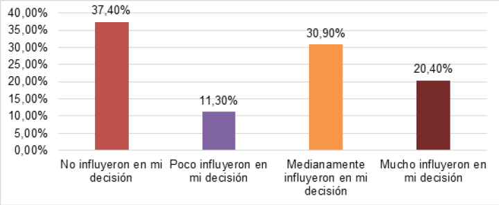 El 37.4% considera que las campañas digitales no influyeron en su voto, el 20.4% respondió que sí, el 11.3% respondió que poco y el 30.9% considera que influyeron en su decisión medianamente; en total, el 62.6% mostró que los medios digitales sí influyeron en su decisión de votar.