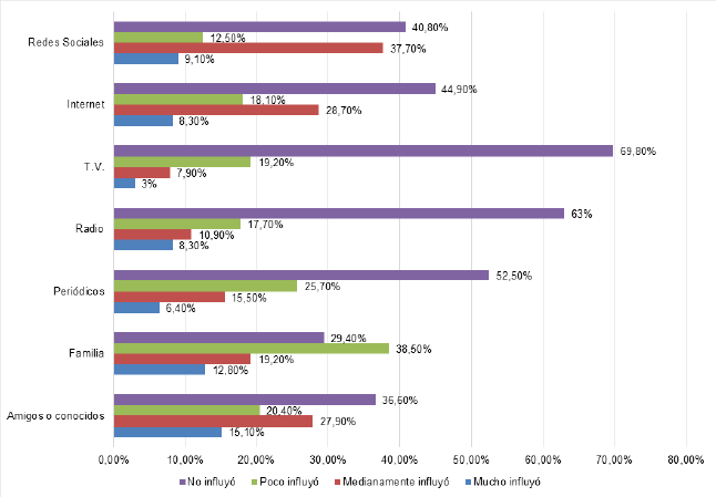 Las redes sociales influyeron más que el internet en las decisiones de voto de las personas; sin embargo, casi la mitad de los encuestados consideran que no, esto debido a una mala estrategia de marketing digital, ya que, como se observa abajo, la radio tiene respuestas similares a la influencia de las redes sociales, lo que también supondría que los medios tradicionales siguen siendo importantes para los votantes.