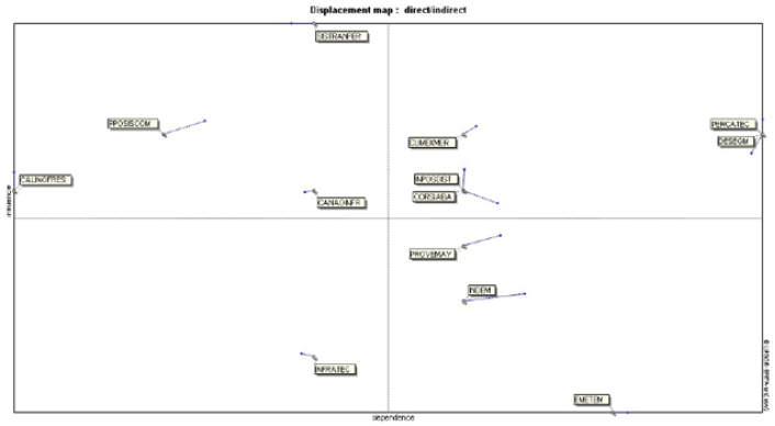 En el plano de influencias y dependencias de la ilustración 3, los transportadores (TRANSPOR) y productores (PROD) aparecen como los actores más influyentes, mientras que proveedores tecnológicos y exportadores muestran mayor dependencia. Esto sugiere la necesidad de fortalecer capacidades tecnológicas y de gestión en los actores más subordinados.