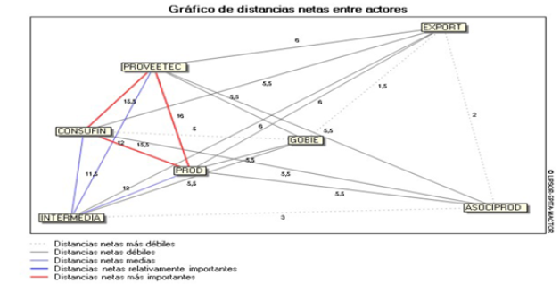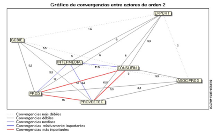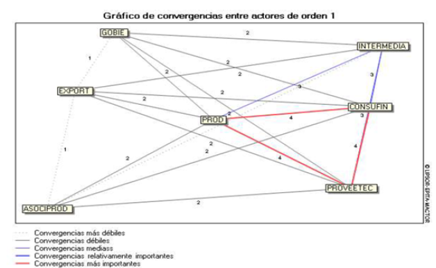 En la ilustración 6 se evidencia las coincidencias de intereses y objetivos entre los principales actores del sistema de comercialización agrícola. Se observan convergencias fuertes (líneas rojas) entre productores (PROD), consumidores finales (CONSUFIN) y proveedores tecnológicos (PROVEETEC), lo que refleja una visión compartida hacia la digitalización y la eficiencia del mercado.