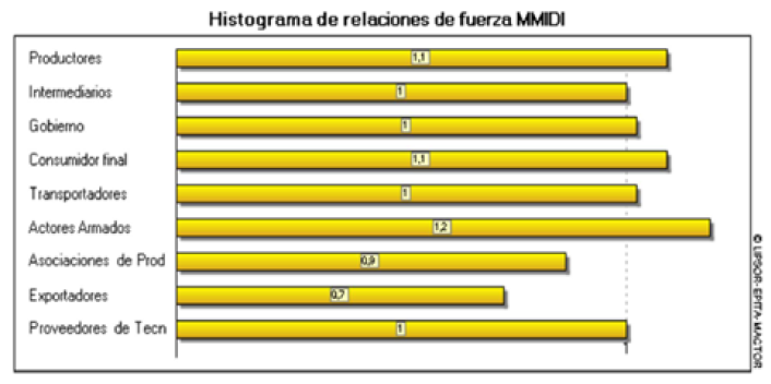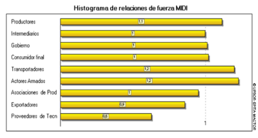 Por su parte, Los histogramas de relaciones de fuerza MIDI y MMIDI muestran La intensidad de las interacciones entre los actores del sistema (ilustración 4 y 5). En ambos casos, los productores, transportadores y actores armados presentan los valores más altos, lo que indica su fuerte influencia en la dinámica de la comercialización agrícola.