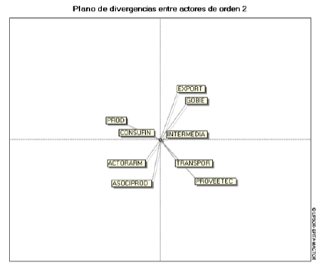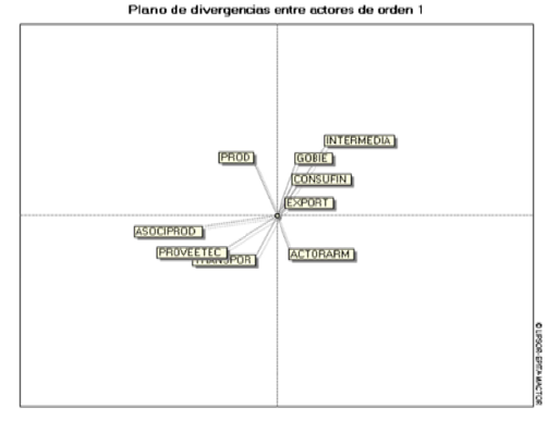 El plano de divergencias entre actores de orden 1 de la ilustración 8, muestra una baja dispersión entre los participantes, lo que indica escasas tensiones directas y una tendencia general hacia la cooperación. Las diferencias más notables se presentan entre productores e intermediarios, reflejando intereses distintos en la distribución y control del mercado.