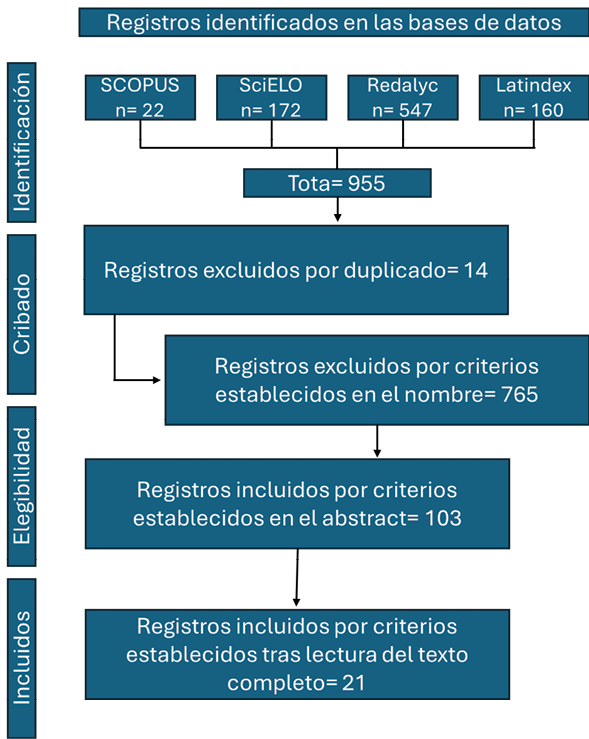 El diagrama 1 muestra el diagrama de flujo PRISMA (2020): Proceso de Identificación, Cribado y Selección de Estudios (Nota: Se insertaría el diagrama de flujo PRISMA 2020 aquí, detallando el flujo de los 955 registros iniciales hasta los 21 estudios finales, según las fases descritas).