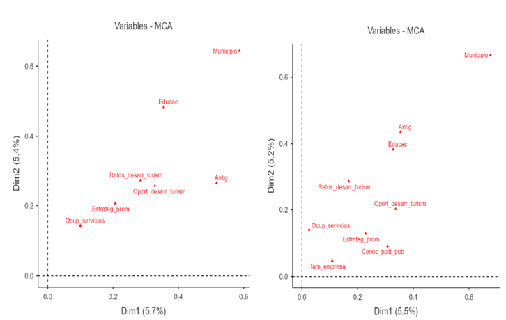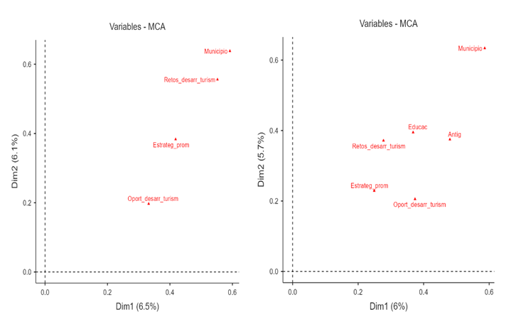 Los resultados obtenidos a partir del Análisis de Correspondencias Múltiples (ACM) ofrecen una visión integral sobre los patrones de relación y las asociaciones latentes entre las dimensiones analizadas. Este enfoque multivariante permite no solo identificar las conexiones más relevantes entre variables, sino también comprender cómo dichas interacciones reflejan la diversidad de vocaciones turísticas presentes en los municipios del centro del Valle del Cauca.
