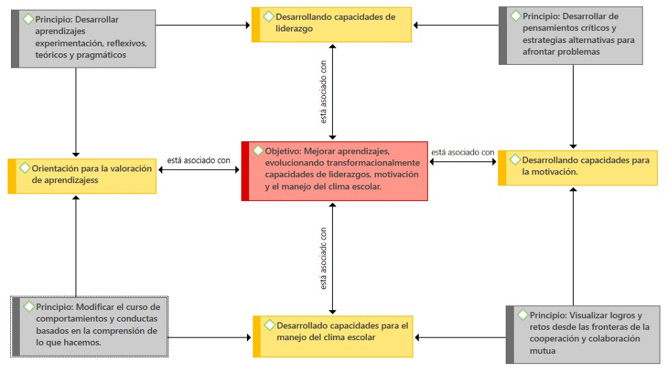 Los modelos pedagógicos holísticos encuentran su eje central en la mejora de los aprendizajes a través del fortalecimiento transformacional de las capacidades de liderazgo, motivación y el manejo del clima escolar. Estas dimensiones se articulan con principios didácticos clave como el desarrollo del pensamiento crítico, la experimentación reflexiva, la valoración de los aprendizajes, la colaboración, el cambio conductual, la comprensión profunda y la resolución de problemas (diagrama 1).