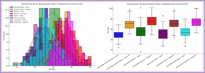 También, los aprendizajes escolares experimentaron una mejora sustancial: el aprendizaje experimental pasó de 64.9% (regular) a 89.4% (bueno), el reflexivo de 78.7% a 89.4%, el teórico de 63.8% a 91.5% y el pragmático de 53.2% a 86.2%. El análisis estadístico mediante la prueba de Wilcoxon indicó diferencias significativas (p < 0.05) entre los rangos previos y posteriores a la intervención.
