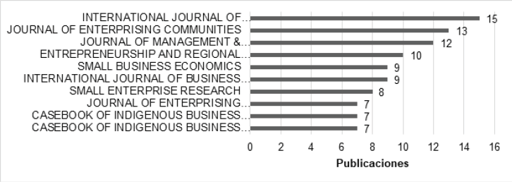 El gráfico 2 muestra que los 10 recursos donde se ha publicado sobre emprendimiento indígena agrupan el 17% del total de las publicaciones. Se encuentra en primer lugar “International Journal of Entrepreneurship and Small Business”, que se enfoca, entre otros temas, en los emprendimientos interculturales con 15 publicaciones; “Journal of Enterprising Communities”, que explora temas sobre relaciones entre individuos, comunidades y empresas con 13 publicaciones; y “Journal of Management & Organization”, enfocado en problemas de gestión y organización con 12 publicaciones.