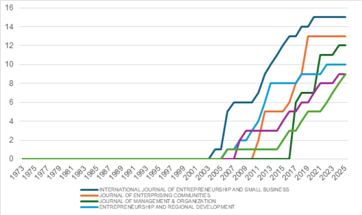 Estos recursos, de manera coherente con la producción por año, han crecido notablemente a partir del año 2003, siendo “international journal of entrepreneurship and small business” la revista con el mayor crecimiento en cuanto al número de publicaciones por año, seguida por “journal of enterprising communities” que muestra un crecimiento notable a partir del 2017 y “journal of management & organization” que ha repuntado desde el 2021 como lo muestra el gráfico 3. Esto deja ver un campo de conocimiento que ha despertado interés en los investigadores.