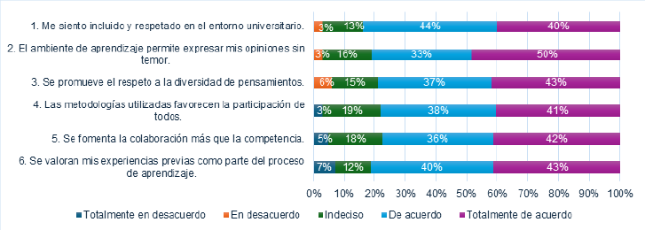 Por lo tanto, un 50% expresó su total concordancia en que es posible manifestar sus puntos de vista sin miedo, mientras que un 44% indicó sentirse integrado y respetado en el ambiente universitario, lo que fortalece la noción de que se fomenta un ambiente de respeto y apertura. Asimismo, el 43% de las respuestas que respaldan la valoración de experiencias previas como parte del proceso educativo corresponden a la categoría “totalmente de acuerdo”, lo que indica un ambiente que valora el bagaje personal del alumno como un recurso útil para su aprendizaje.
