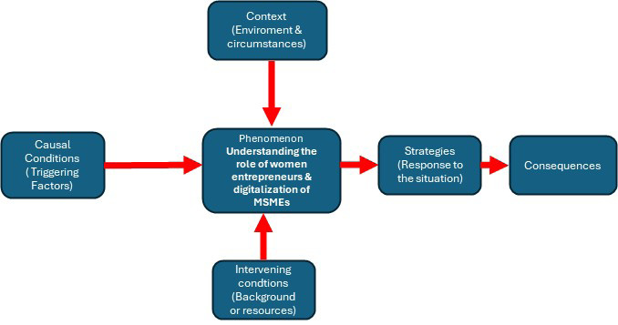 Regarding open coding , the data obtained from the interviews was examined line by line, extracting 278 codes. These codes were then refined, eliminating duplicate concepts associated with different categories, resulting in 30 codes.Following the paradigm of Strauss and Corbin (1998) for the axial coding strategy, considering the phenomenon of entrepreneurs women role in the digitization of their MSMEs, the causal conditions include the motivations for entrepreneurship, while the intervening conditions include challenges and obstacles, structural influences, and social influences. The context, considering the complexity of MSMEs, actions and strategies, are the responses to the phenomenon and the intervening conditions, and consequences are the negative or positive results of the entrepreneurial process. In this phase, they were grouped into 30 codes and 7 subcategories (table 1).