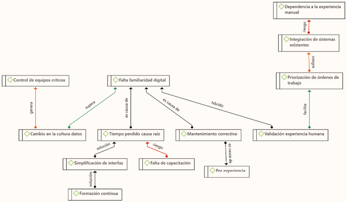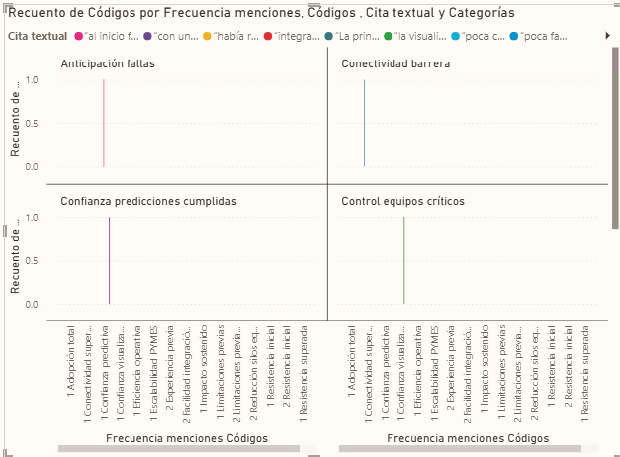 Los códigos de la ilustración 1, realizados con el apoyo de Power BI, muestran algunos momentos clave del cambio: confiar en el sistema, anticipar fallas, superar las limitaciones de conectividad y sentir mayor control sobre los equipos críticos; lo que se puede interpretar es cómo ciertos códigos tienen baja frecuencia, pero alto contenido explicativo, y su valor reside más en la profundidad de las citas y en la triangulación con los datos numéricos que en el número de ocurrencias.